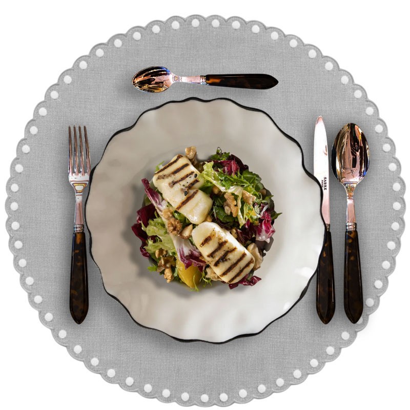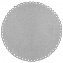 Mantel individual con bodoques bordados, bajoplato, en lino Lituano de la colección Bespoke. Medida aproximada 38 cm de diámetro.