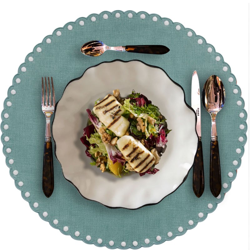 Mantel individual con bodoques bordados, bajoplato, en lino Lituano de la colección Bespoke. Medida aproximada 38 cm de diámetro.