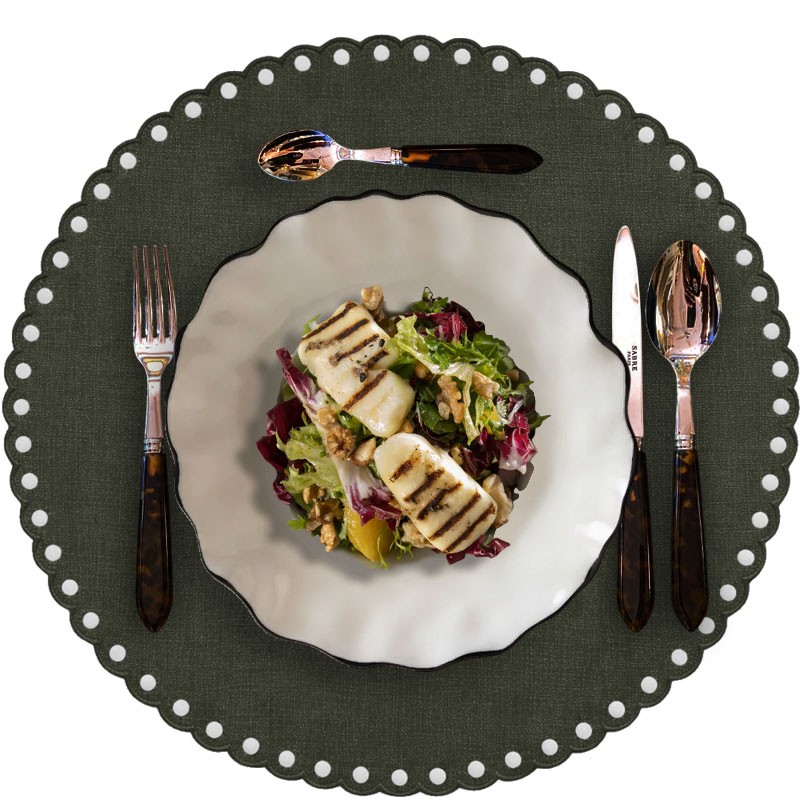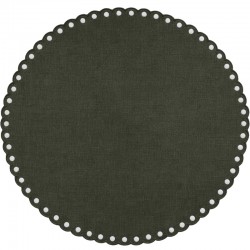 Mantel individual con bodoques bordados, bajoplato, en lino Lituano de la colección Bespoke. Medida aproximada 38 cm de diámetro.