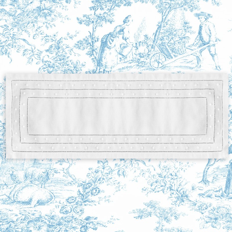 CAMINO `ESSENCE BLANCO 40X90 cm, bordado a mano sobre semihilo 100%. El tamaño aproximado es de 40X90 cm.