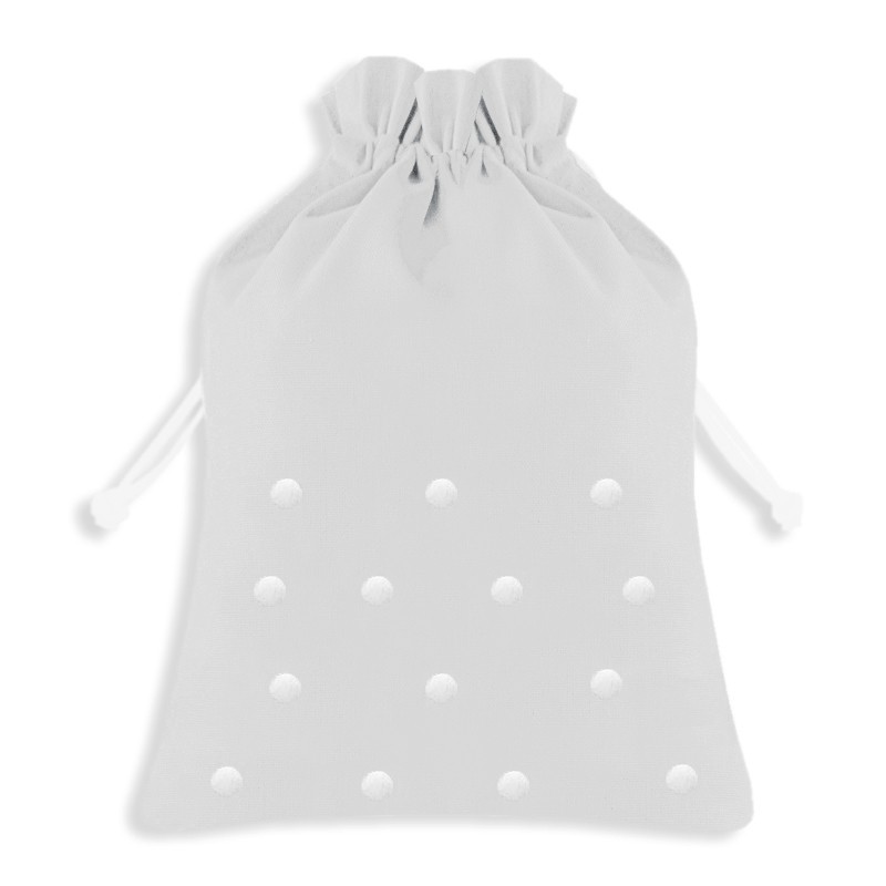 Bolsa de aseo en en 60% lino 20% viscosa con bodoques bordados a mano. Disponible en tres tamaños.