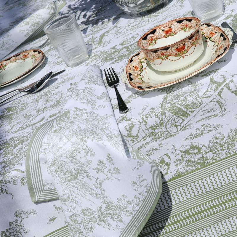 Mantelería en lona de algodón 100%. Estampado en Toile de Jouy.