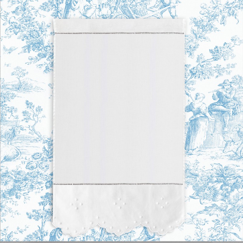 Toalla visillo en semi hilo con vainicas y bodoques. El tamaño aproximado es de 40X60 cm.